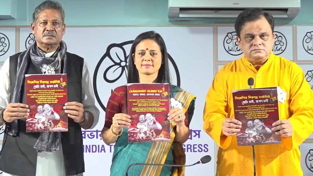 State Education Minister Bratya Basu and two MPs, Kirti Azad and Mahua Moitra, convened a news conference and delivered a “charge sheet” on behalf of the Trinamool.